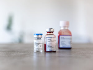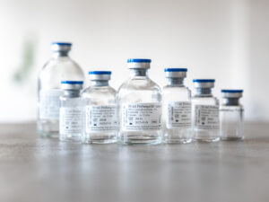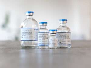 Die Gefäße sind Klarglas-Flaschen aus Röhrenglas gemäß DIN EN ISO8362-1 (10ml, 20ml und 25ml) bzw. aus Hüttenglas gemäß DIN EN ISO8362-4 (30ml, 50ml und 100ml), der hydrolytischen Klasse I (Borosilikatglas), mit aufgesetztem Gummistopfen Typ I, (Mehrfachdurchstechung möglich), verschlossen mit einer Flip-Top-Bördelkappe, die mit einer Kunststoffkappe aus PP versehen ist. Diese wird vor Gebrauch des Gefäßes entfernt und gibt dann eine ca. 8 mm durchmessende Durchstichstelle des Septums frei.